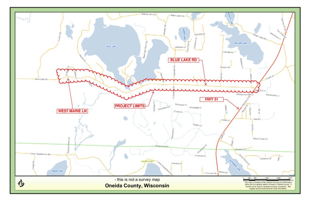 The section of Blue Lake Road from Agawak Road to just east of Sutton Road, approximately 2.2 miles, will have crack repairs and a new asphalt overlay matching the current roadway width. Shoulders will be re-graveled.